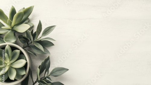 A minimalist arrangement of succulents in a white pot against a white wooden background.