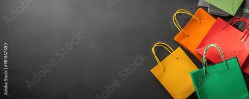 A minimalist Black Friday background featuring scattered shopping bags and price tags