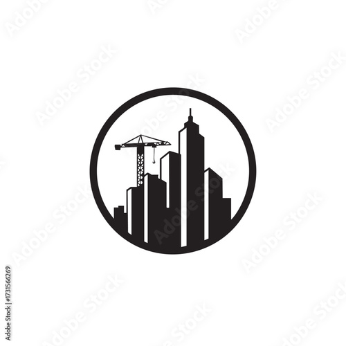 A minimalist black silhouette of a modern city skyline, featuring tall buildings and an active construction crane, symbolizing urban development and progress.