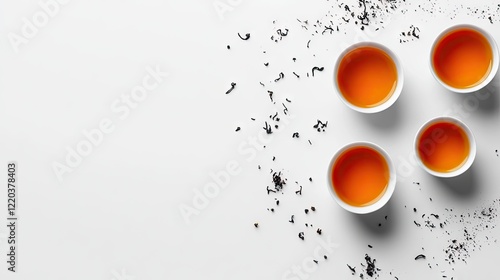 A minimalist flat lay of fresh herbal teas in small cups surrounded by loose tea leaves.