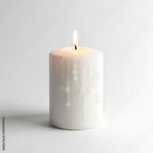 A minimalist, high-key photograph showing a solitary, bright white candle actively burning, creating a calm, meditative ambiance.