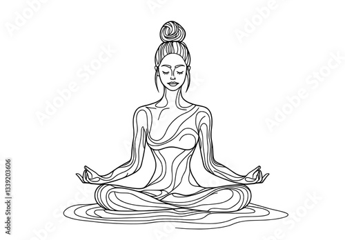 A minimalist illustration of a woman in lotus pose is depicted in a single line drawing, showcasing a trendy and modern female figure in a continuous abstract design