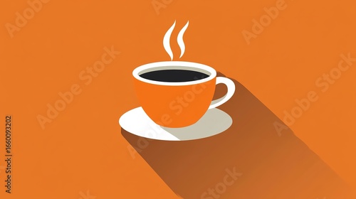 A minimalist illustration of an orange coffee cup with steam rising, set against a vibrant orange background.