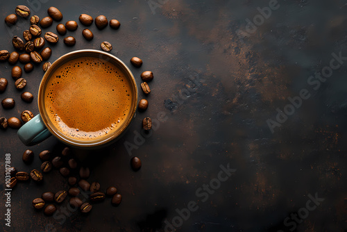 A minimalist image of a mug of coffee surrounded by coffee beans, capturing simplicity and warmth