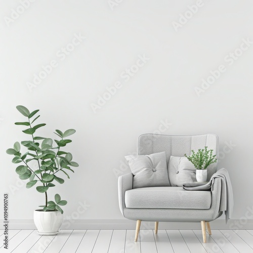 A minimalist living room with a gray armchair, potted plants, and white walls with greenery crawling up the walls