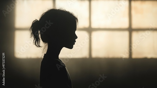 A minimalist silhouette of a young girl in front of a window. Mysterious and quiet.