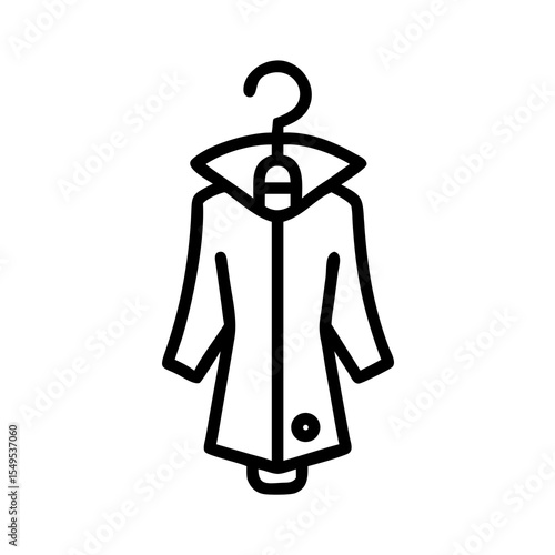 A minimalist vector graphic of a coat hanging on a hanger, outlined in black