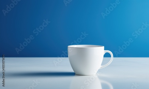 A minimalist white cup positioned on a smooth surface against a vibrant blue backdrop, displaying a contemporary mockup design concept