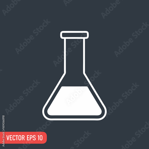 A minimalist white line icon of a conical laboratory flask containing liquid on a dark background.