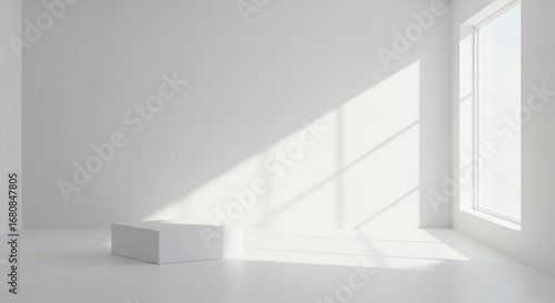 A minimalist white room with a box and sunlight streaming through a window casting shadows on the wall