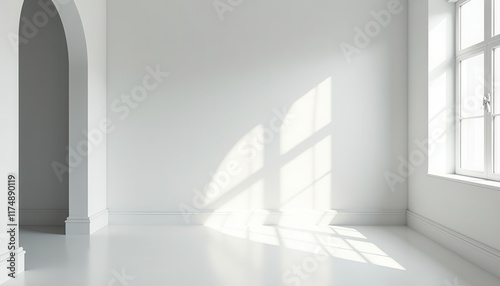 A minimalist white studio room with clean lines creates a fresh, bright backdrop.