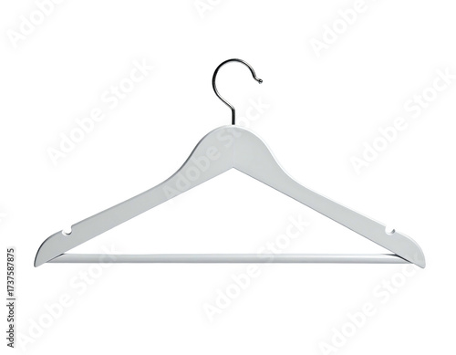 A minimalist white wooden coat hanger with a chrome hook on a black background