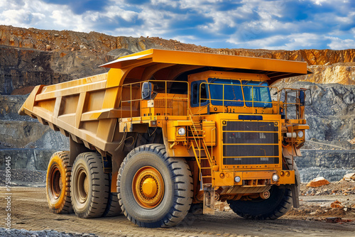 A mining dump truck navigates through the quarry, its enormous tires gripping the rugged terrain as it transports heaps of earth and minerals.