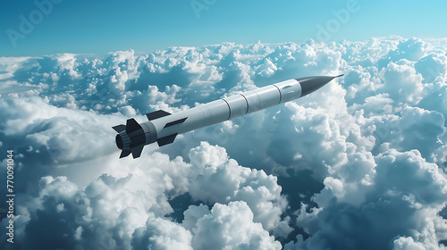 a missile soaring through the sky above a layer of fluffy white clouds. The missile is white and black in color