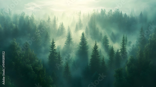 A misty forest landscape with tall trees and soft light filtering through the fog.