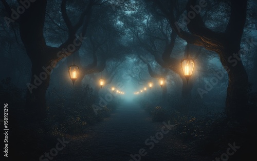 A misty forest path illuminated by lanterns, creating an enchanting and mysterious atmosphere.