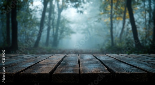 A misty forest scene with a wooden table in the foreground.