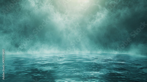 A misty, hazy sky with a large body of water in the foreground