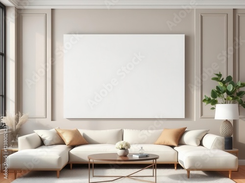 A mockup of a blank wall art canvas displayed in a modern living room setting, perfect for showcasing artwork or photography, modern, interior design, wall art