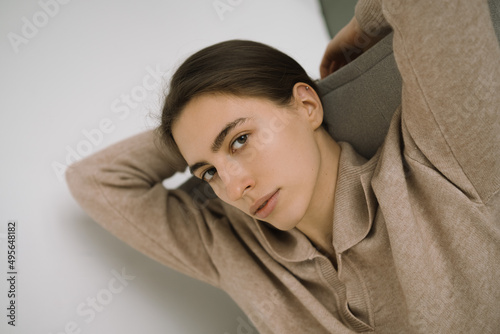 A model with long dark hair pulled back in a ponytail poses for a catalog, looks at the camera, dressed in a beige turtleneck with a neckline