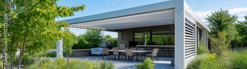A modern backyard that brings nature and sleek design together, offering an elegant and peaceful space for relaxation, outdoor dining, and entertaining guests in a stylish environment