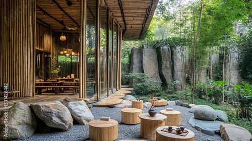 A modern bamboo building with outdoor garden seating areas