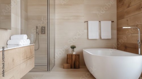 A modern bathroom showcasing a sleek, elegant design with neutral tones, featuring a bathtub, glass shower, wooden elements, and white towels, exuding a sense of calm and luxury.