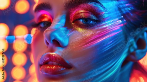 A modern beauty blogger demonstrating makeup techniques with a vibrant digital background