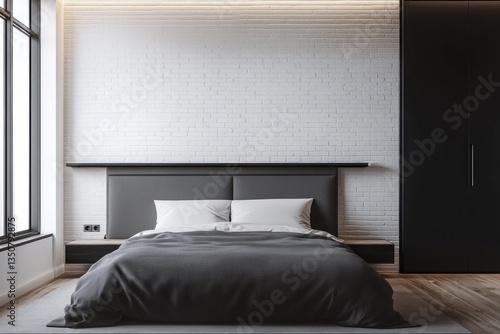 A modern bedroom features a bed and a closet with minimalist design
