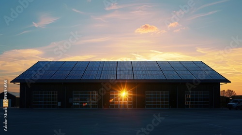 A modern building with solar panels reflects the sunset, showcasing sustainable energy practices and innovative architecture.