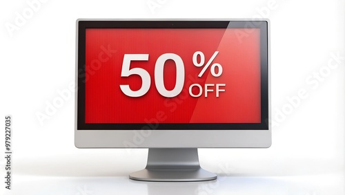 A modern computer monitor displaying a bold '50% OFF' discount on a vibrant red background, perfect for promotions.