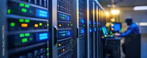 A modern data center with illuminated servers and a technician working at a computer, showcasing advanced technology and infrastructure.