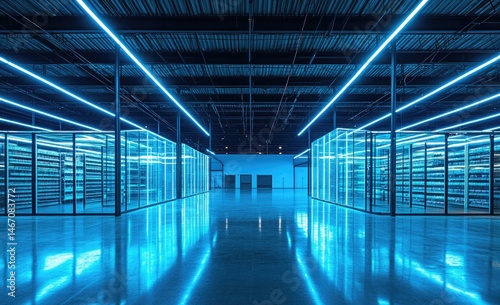 A modern. high-tech storage facility showcasing illuminated shelves filled with products. with a sleek. reflective floor and a vibrant digital display in the background