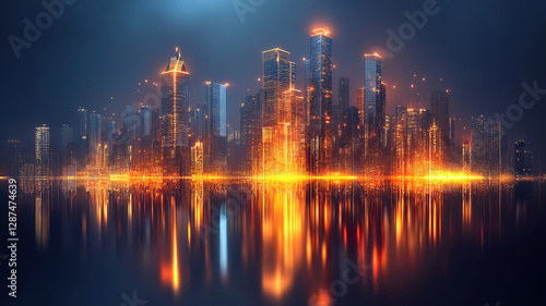 A modern hi-tech cityscape featuring urban architecture with neon lights and a digital tech concept