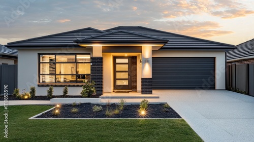 A modern home with stylish outside shutters and roller blinds on the windows, creating an elegant exterior while enhancing functionality.