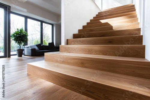 A modern interior featuring wooden stairs leading to an upper level, with large windows and a potted plant enhancing the ambiance.