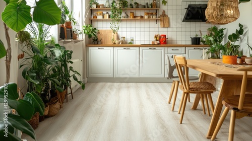 A modern kitchen with newly installed SPC vinyl flooring, showcasing its moisture-resistant properties.