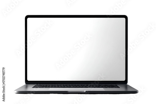 A modern laptop with a blank screen. Grey metal chassis, rectangular screen, keyboard visible