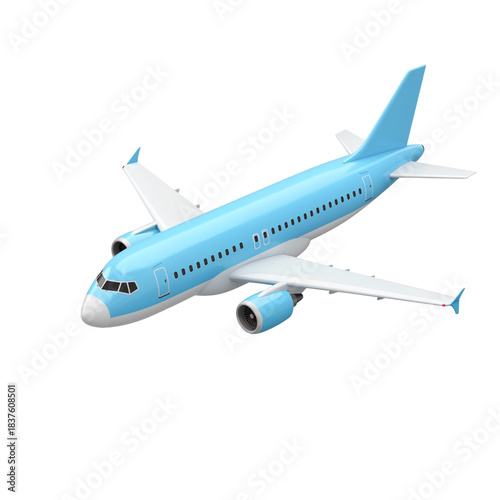 A modern light blue passenger jet airplane with white wings and engines isolated on transparent background
