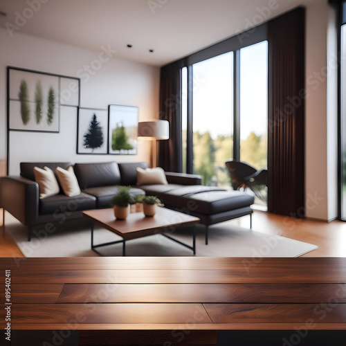 a modern living interior featuring a dark wood table with a blurred modern apartment living room in the background. Highlight the sleek and contemporary design.