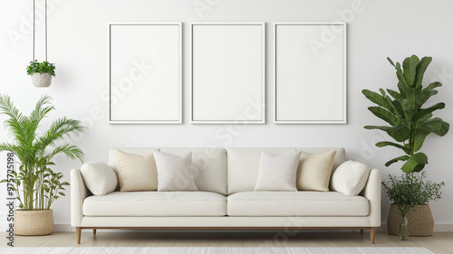 A modern living room featuring cozy sofa, empty frames, and lush plants
