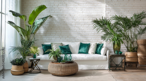 A modern living room interior featuring a white brick wall, a comfortable sofa, elegant tables, and lush houseplants