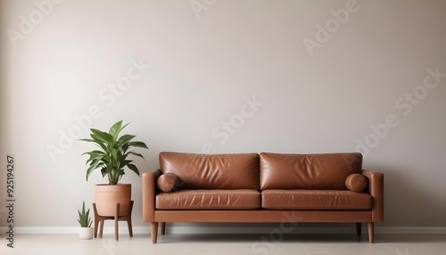 A modern living room with a brown leather sofa, a potted plant, and a wooden side table.