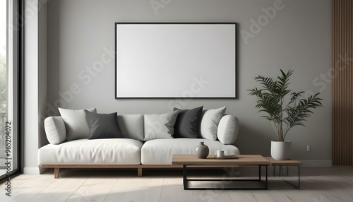 A modern living room with a large blank white frame on the wall, a gray sofa, a wooden coffee table, and decorative pillows