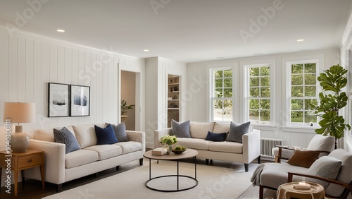 A modern living room with neutral tones features large windows, cozy sofas with pillows, a coffee table, indoor plants, stylish artwork, and wooden flooring.