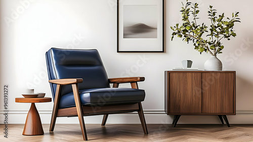 A modern living space featuring a stylish chair, side table, and decorative elements.