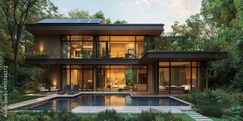 A modern, luxurious home with a large pool and lush greenery surrounding it.