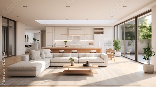 A modern minimalist home interior design with clean lines, sleek furniture, and neutral color palette, featuring an open-concept living space connected to a spacious kitchen, bathed in natural light