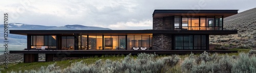 A modern, minimalist house with large windows, nestled in a natural landscape, featuring sleek lines and a harmonious blend of architecture and nature.