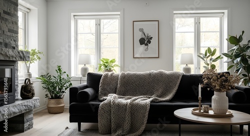 A modern minimalist living room decorated in monochrome tones with cozy textures and natural light from large windows.